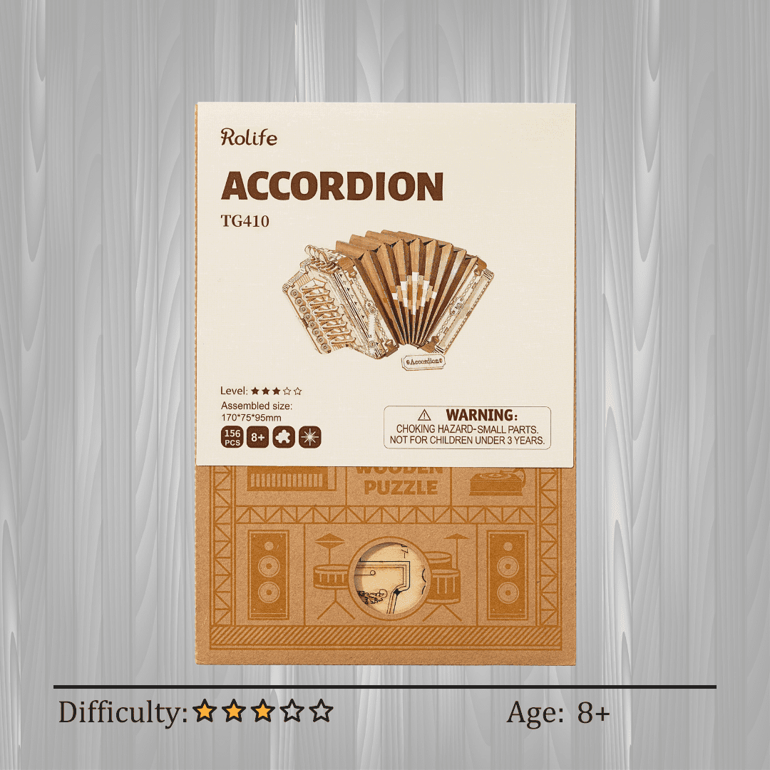 The Accordion 3D Wooden Puzzle is a captivating and intricate model kit that beautifully replicates the charm of a classic accordion. Crafted from high-quality, eco-friendly wood, this puzzle features precision laser-cut pieces that fit together seamlessly without the need for glue or adhesives. The detailed design showcases the intricate mechanics of the accordion, complete with bellows, keys, and buttons, capturing the essence of this beloved musical instrument. Perfect for adults, teens, and older children, this puzzle offers a rewarding and educational building experience that enhances creativity and problem-solving skills. Ideal as a unique gift, the Accordion 3D Wooden Puzzle provides hours of engaging entertainment while serving as a stunning decorative piece, celebrating the artistry and craftsmanship of traditional musical instruments.